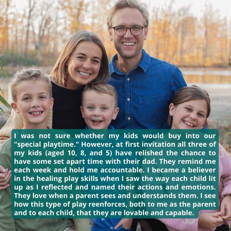 You and your spouse will learn the three core skills that transform ordinary play into therapeutic, healing play through a 20 minute, once weekly ritual called Special Play Time.